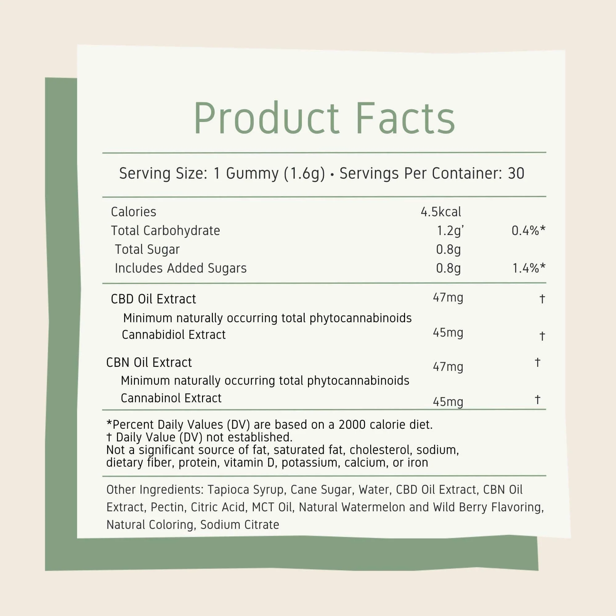 CBD:CBN gummies contain 45mg of CBD & CBN per gummy. Full spectrum hemp-extracted cannabinol with sedative effects for a nights sleep.Â